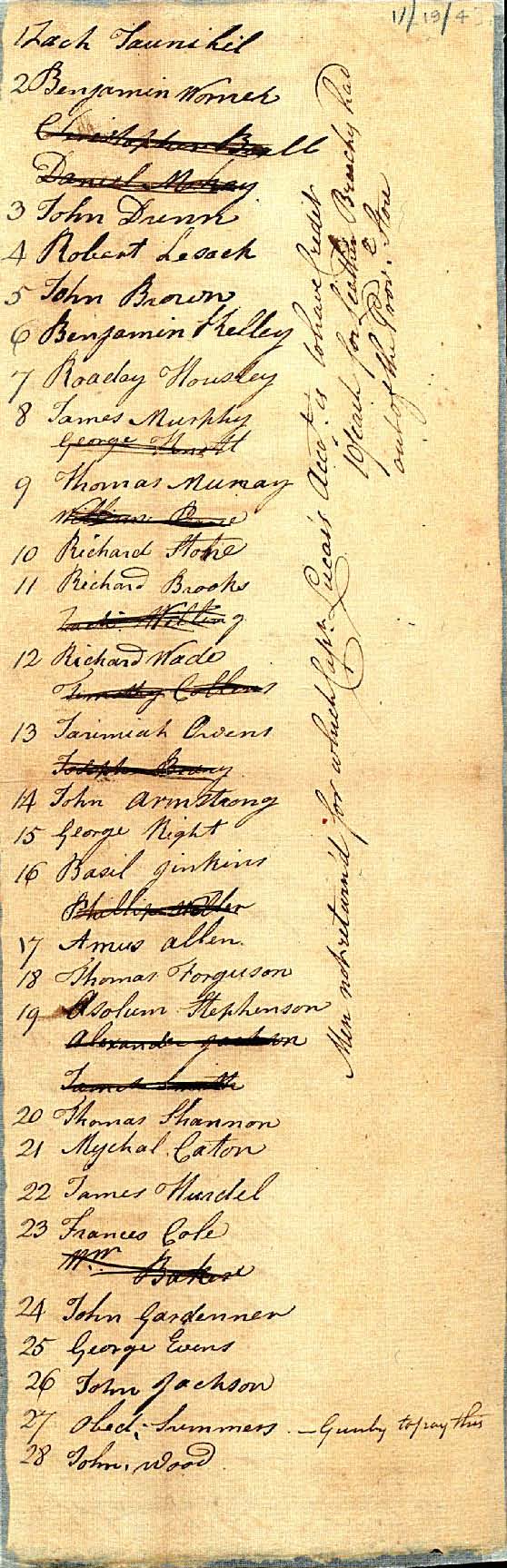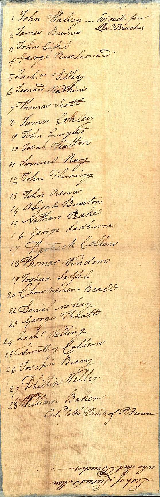 Another of the documents has a list of “Men not return’d,” but it is unclear if they did not return from the battle, were not included on the company’s written return, or something else altogether. Some of our other sources indicate that a few of the men on this list were no longer in the company by the time the Battle of Long Island was fought, so it may be from too early in the war to be helpful. Written on the back of this list is another, labeled “List of Lucas’ Men who had Breeches.” Little is known about the men named on it, and it gives no indication of its proximity to the battle.