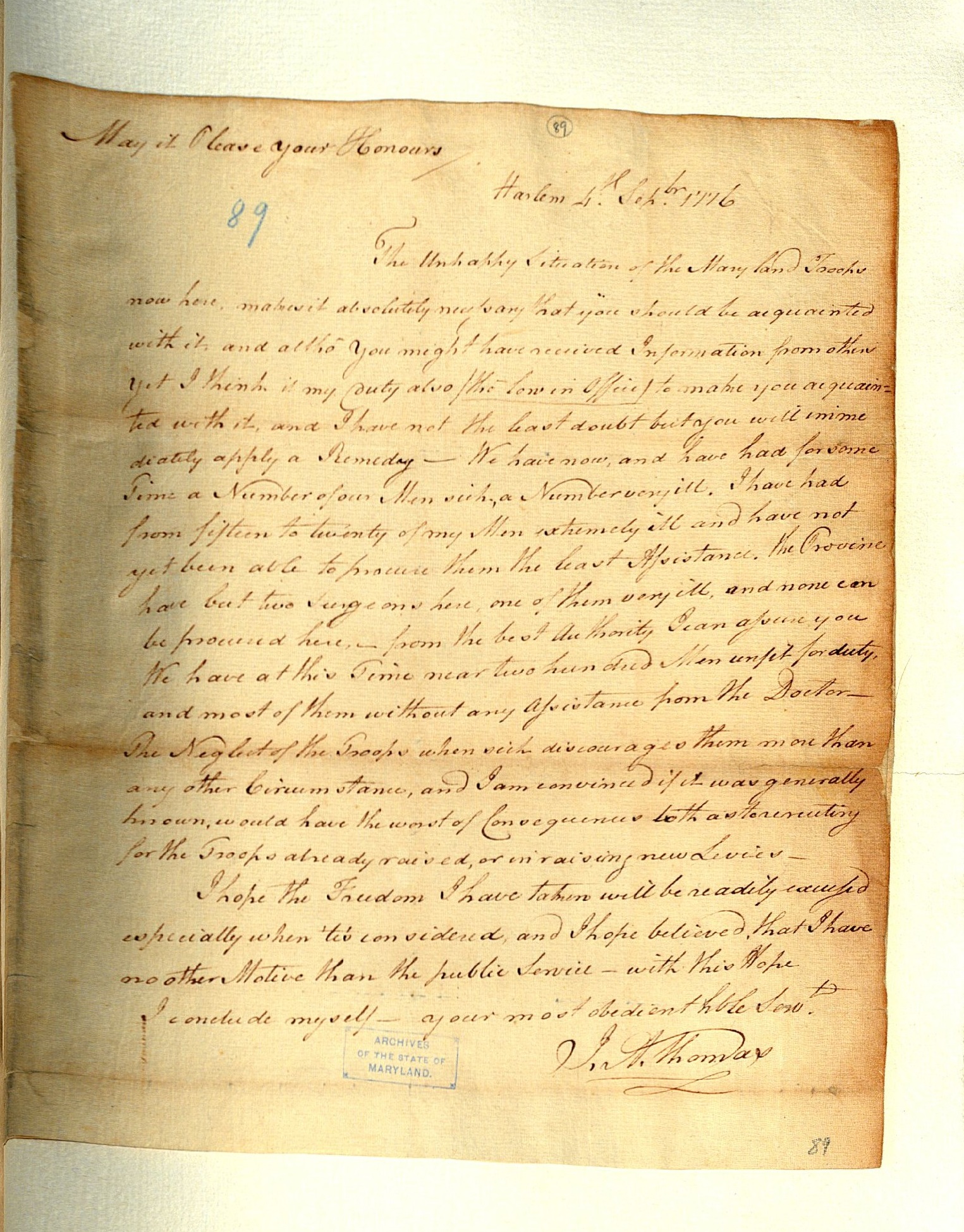 On September 4, John Allen Thomas, Captain of the 5th Independent Company, wrote from Harlem to Annapolis in a bid to improve their intolerable conditions. He reported “the unhappy situation of the Maryland Troops,” to the Maryland Council of Safety.[2]