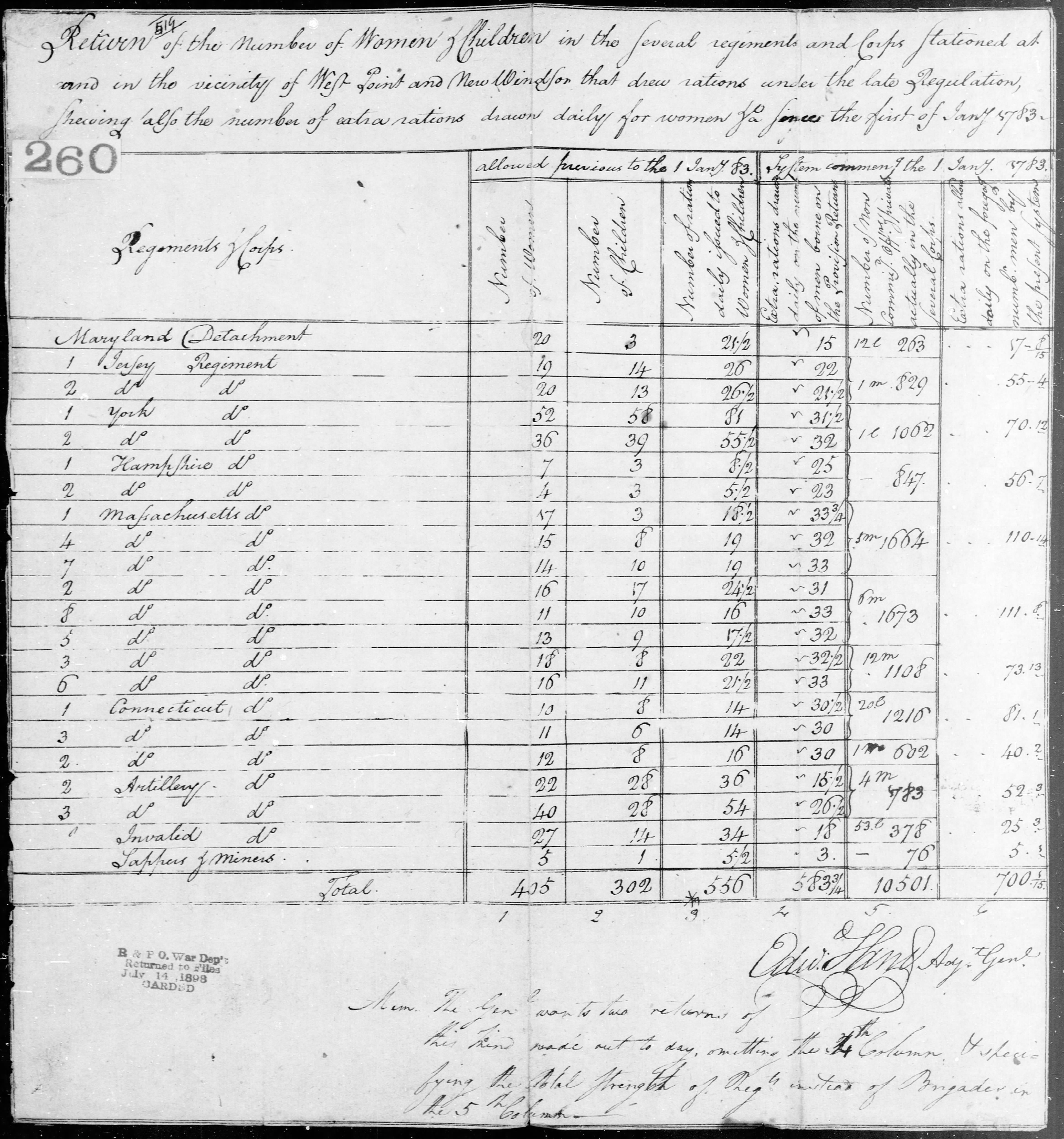 [7] Return of the number of women & children in the various regiments. National Archives. Revolutionary War Rolls 1775-1783. NARA 602384. From fold3.com.
