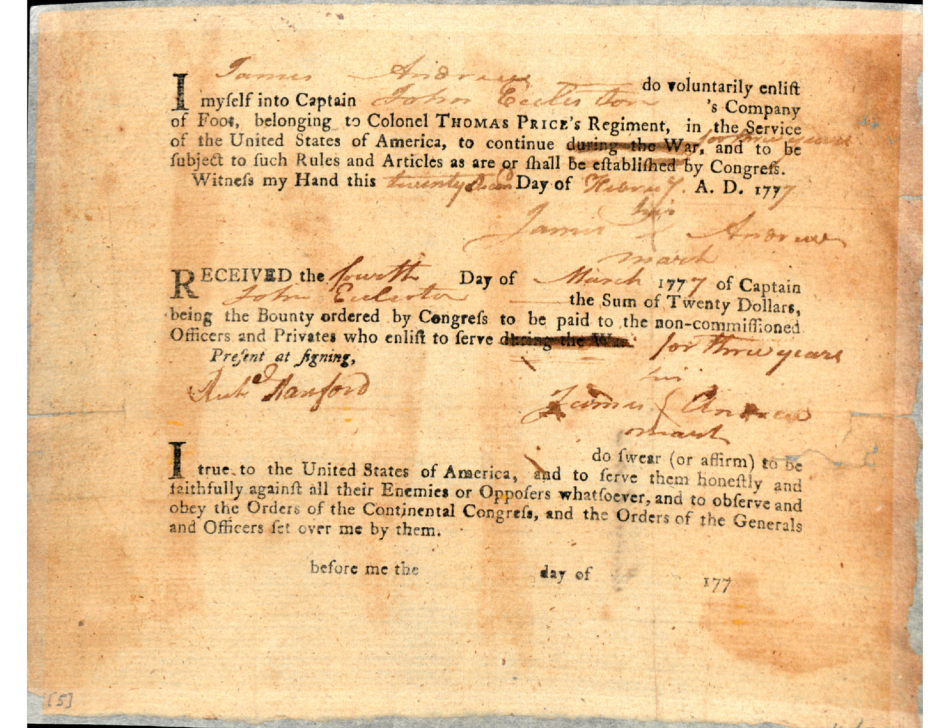 James Andrews’ 1777 reenlistment receipt. MARYLAND STATE PAPERS (Revolutionary Papers) MSA S997-16-5.
