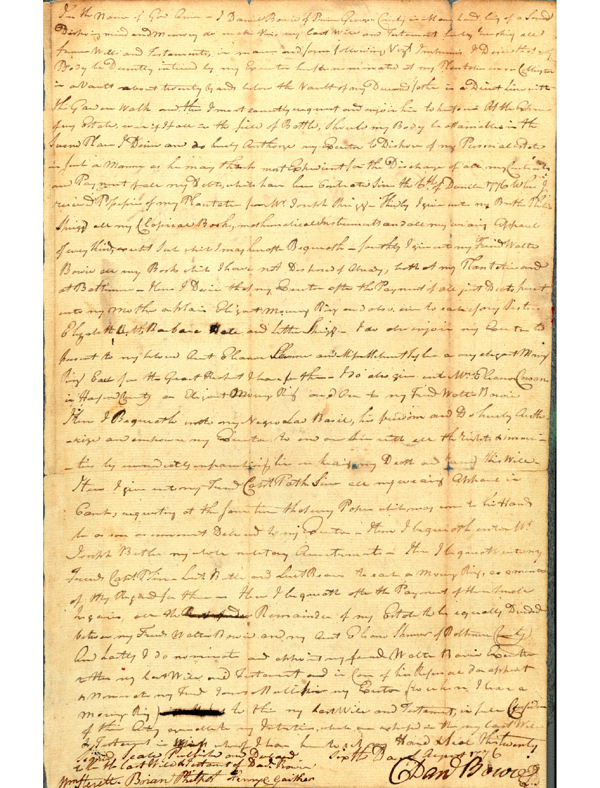 Daniel Bowie’s will, August 26, 1776. Source: Prince George’s County Original Wills, box 12, folder 44.