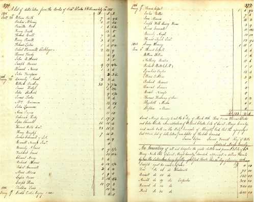 The time when Neale died was a transitional period for Maryland’s monetary policy. Maryland at the time was transitioning from Maryland pounds to American dollars, with inventories being appraised in either currency. Neale’s was appraised in dollars, but it can be noted that the inventory before his, a list of debts owed to a Richard Clarke Williams dated July 20, 1815, was appraised in Maryland pounds (the rate of conversion at the time was 2.66 Maryland pounds for every dollar).What was listed first was often considered the most important property: slaves. At the time of his death Neale owned forty two slaves, about the average of someone of his social status. Neale was a political leader and office holder in the local court and Maryland House of Delegates as a Federalist. He owned about 700 acres around the time of his death and considerably more at the turn of the nineteenth century, when he was considered the eleventh wealthiest man in Saint Mary’s County. The slaves’ ages and worth are listed, as well as notes for specific slaves listing occupations and if they were infirm. All together the slaves make up about eighty percent of the worth of Henry Neale’s estate.