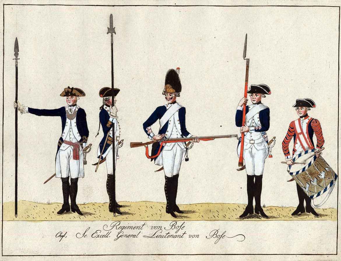 Hessian soldiers with spontoons and bayonets. These spontoons appear to be much taller than the six-foot American weapons.