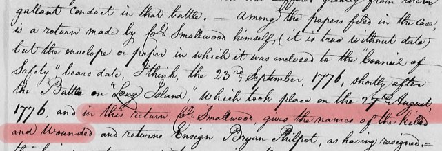 In 1855, Brewer wrote to the U.S. Commissioner of Pensions regarding the military service of Bryan Philpot, who had been an ensign in the Eighth Company in 1776, and nearly drowned while retreating through the Gowanus Swamp at the Battle of Brooklyn. Philpot’s widow Elizabeth was eligible for a pension as the wife of a Revolutionary veteran, but there was some dispute about the documentation of Philpot’s service. To help bolster her claim, Brewer described how “Among the papers filed in the case is a return made by Col. Smallwood himself…and in this return Col. Smallwood gives the names of the Killed and Wounded [at the battle]. This [was] a return made to reorganize the corps.” [4] Such a reorganization was necessary after the battle since the Marylanders lost so many men that some companies had to be consolidated in order to have enough men to be effective.
