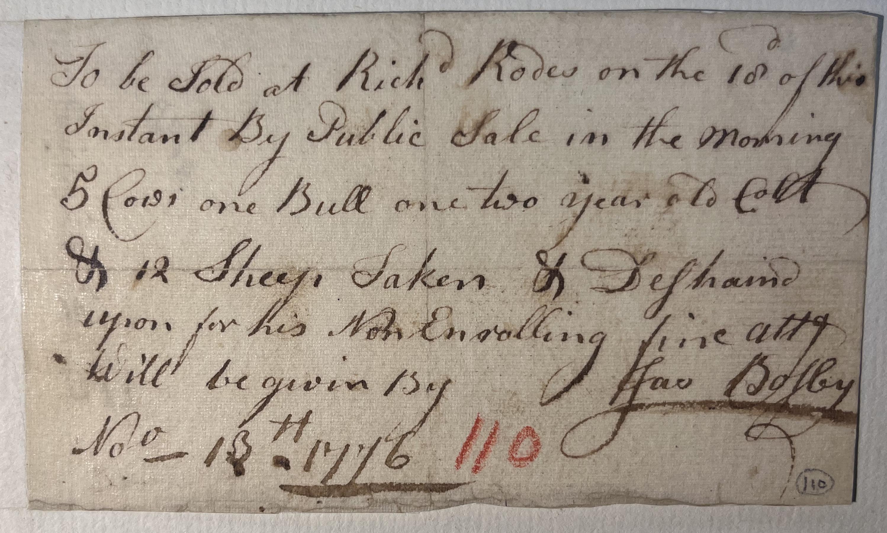 Despite the many depositions in Trapnall’s favor, on January 29, 1777, the Council of Safety ordered his arrest. Indeed, the large number of depositions in support of Trapnall may have harmed his case, leading the Council to conclude that a substantial group of Loyalists truly was present at Rodes’ plantation when Bosely arrived. The depositions in favor of Bosely are more descriptive, colorfully capturing the vulgar tone of Trapnall’s conversation. But perhaps the strongest piece of evidence against Trapnall and Rodes is that, in fact, the planned sale of seized goods did not take place. There would be no reason for Bosely and his men to cancel the sale unless they felt threatened or intimidated.12